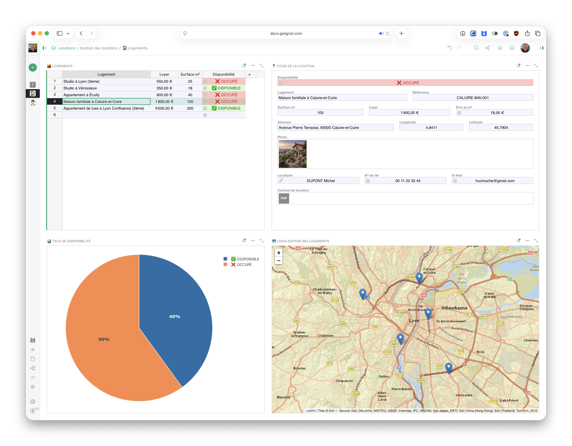 - Des vues multiples pour les mêmes données : Vous n’êtes pas coincé dans la grille. Vous pouvez transformer une table en une vue « Fiche » (idéal pour voir tous les détails d’un contact), en un tableau Kanban (parfait pour suivre l’état des projets), en graphiques, ou encore sous forme de carte géographique. Vous pouvez même construire des tableaux de bord mélangeant ces différentes vues sur un seul écran (voir le visuel ci-dessous).